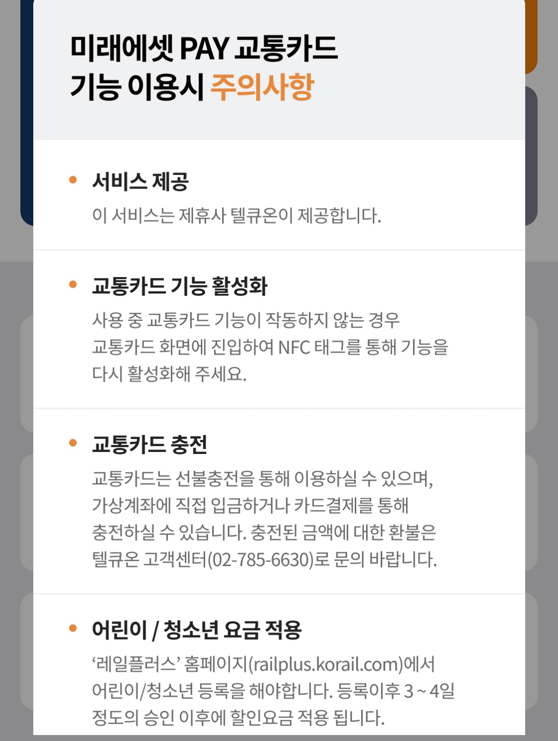 미래에셋페이 교통카드는 텔큐온이 제휴사이기 때문에