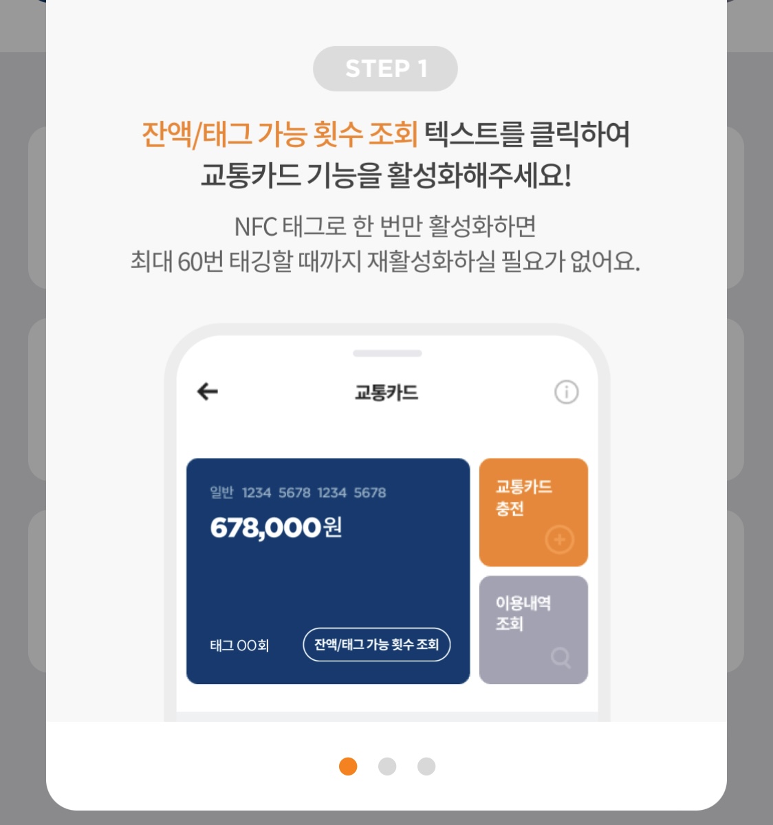 한번 활성화 하면 앱을 켜지않고 교통카드 기능을 60번까지 태그 가능합니다.